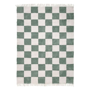 Dywan szachownica - Blox Fringe Zielony to doskonałe połączenie nowoczesnych trendów i retro estetyki. Jego radosny wzór w kratkę doda każdemu wnętrzu świeżości i dynamiki. Frędzelki bo bokach prezentują się niezwykle uroczo i dodają dywanowi lekkości.